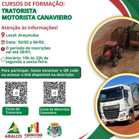 Estão abertas as inscrições para os cursos de Tratorista e Motorista Canavieiro, oferecidos pelo Programa Capacitar, do Grupo Aralco.